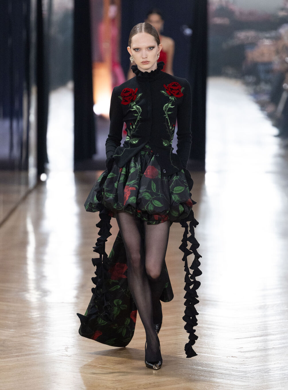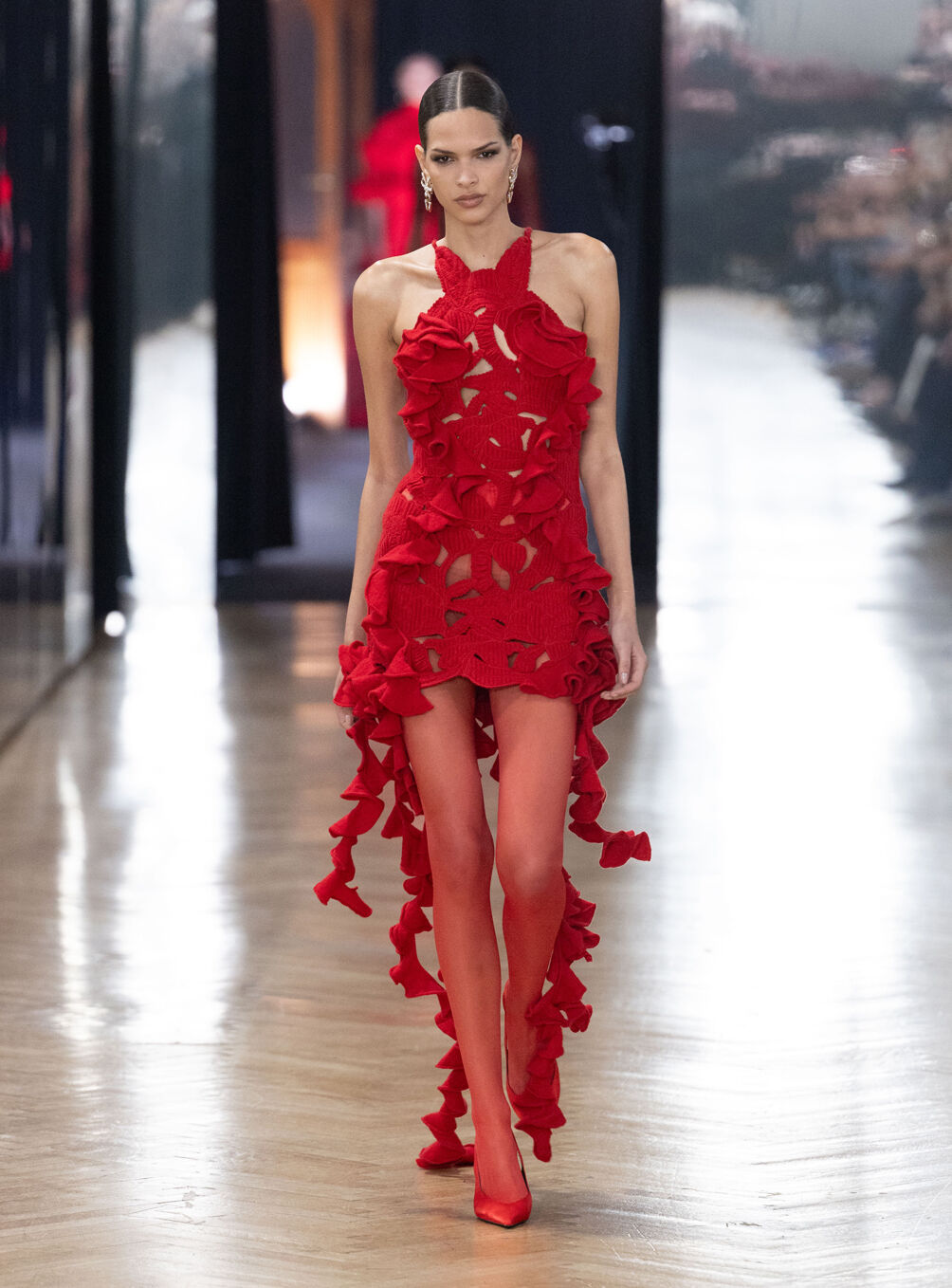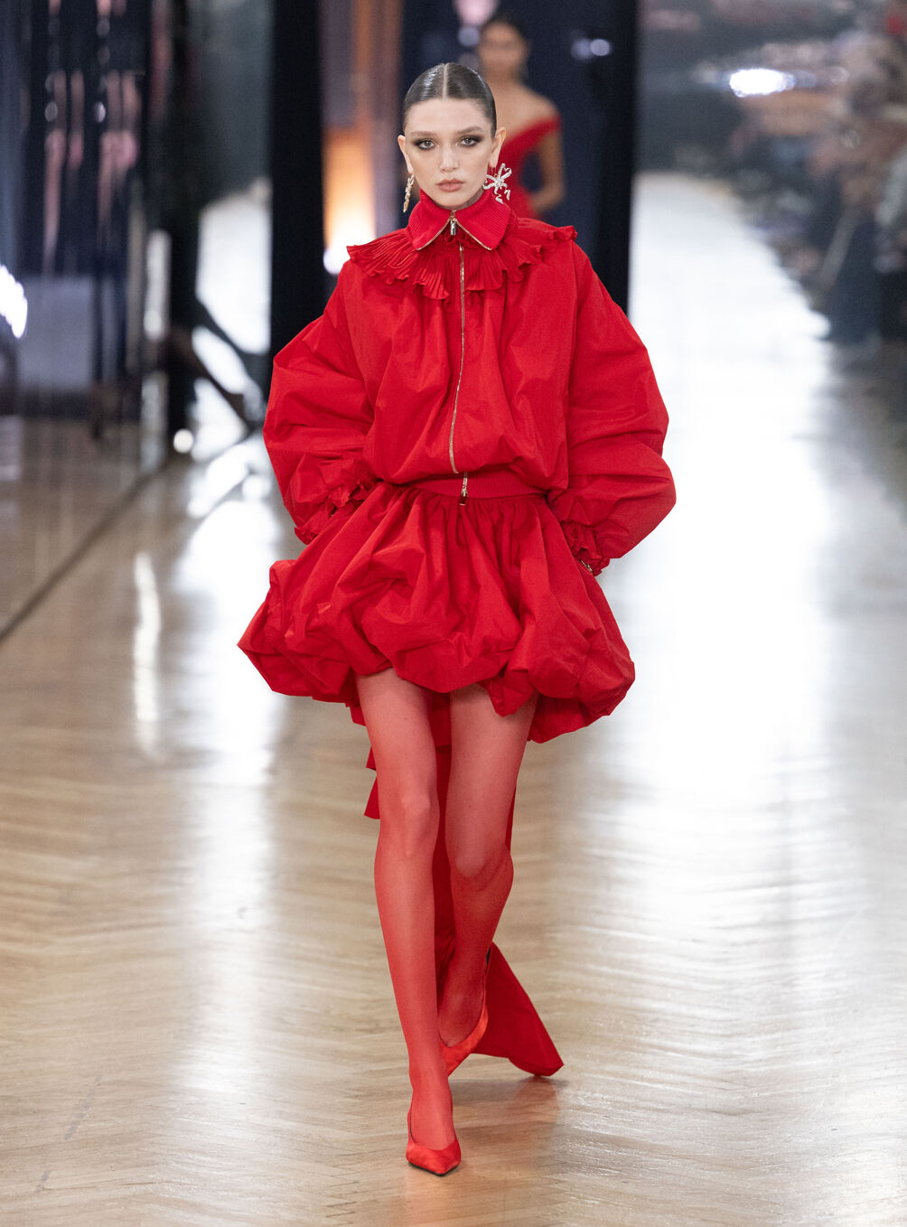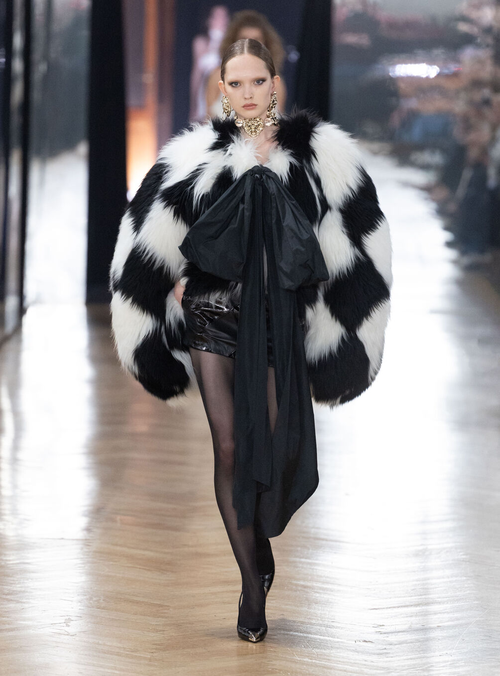 The diva personifies the Italian comprehension of glamour as power. With operatic might, she embodies a seductive spectacle of strictness and softness; of ferociousness and fragility all at once. The Blumarine Fall-Winter 2026 Collection paints a portrait of the mythological diva and her many facets through the lens of its own history. Expanding on his ongoing studies of the photographic legacy of the House – with particular reference to its collaborations with Helmut Newton – David Koma revisits Venice in an elaborate exploration of the city’s cinematic and sumptuous spirit. Staging a meeting between its baroque opulence and his own sculptural modernism and ornamentation, the Creative Director mirrors the city in the diva herself. The fusion cuts a proposal of voluminous and vivacious silhouettes rendered in a darkly theatrical palette of red, black, white, silver and gold.