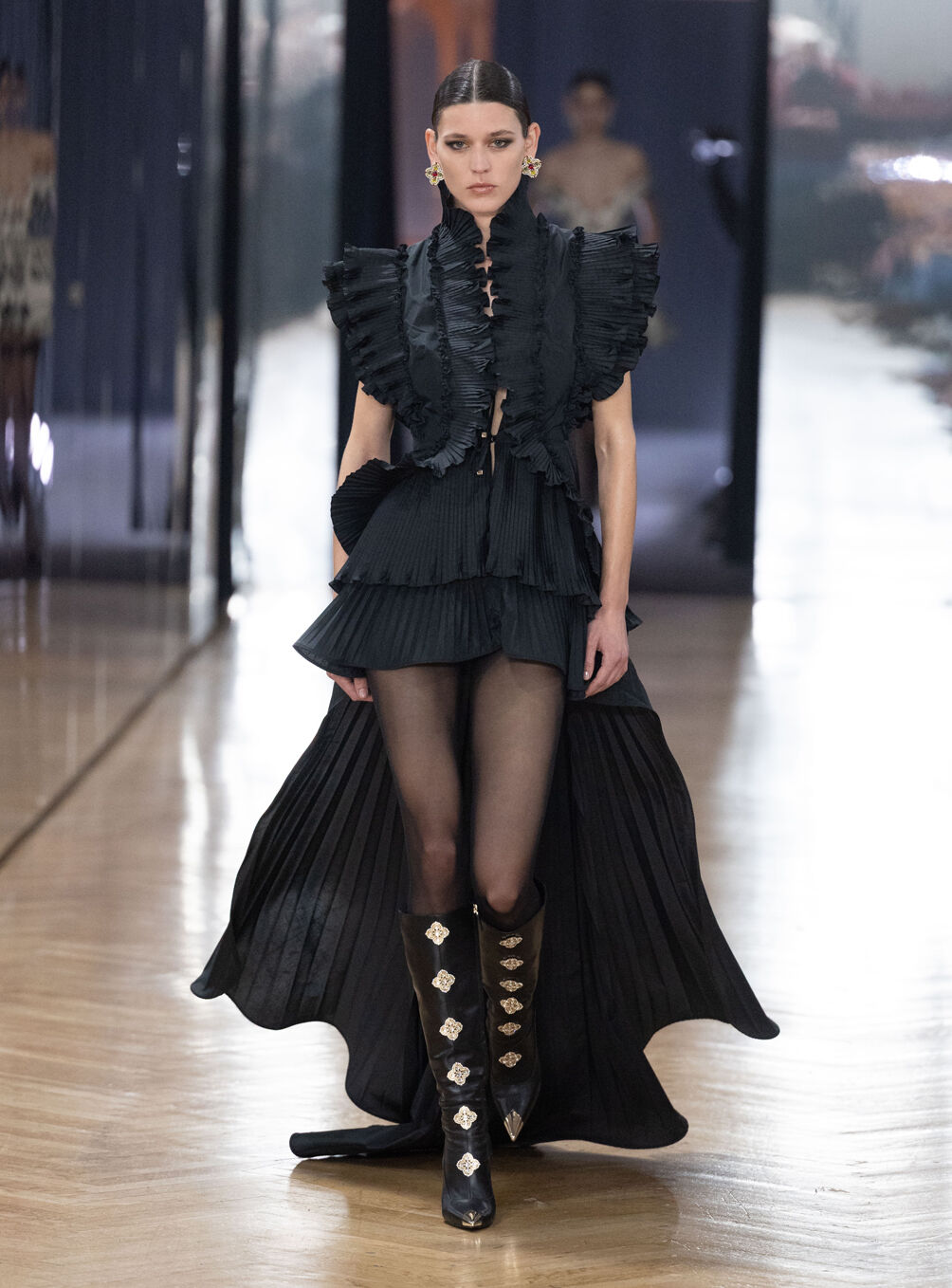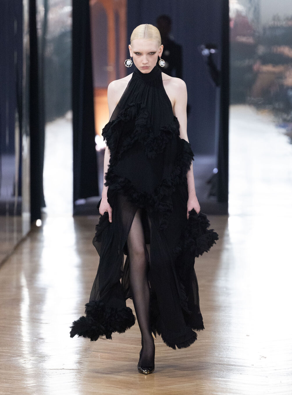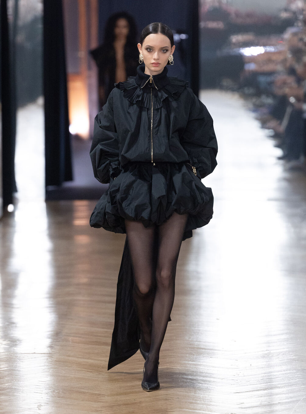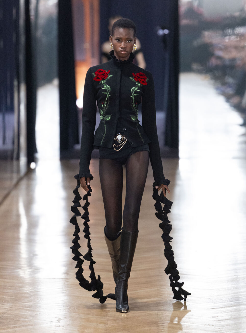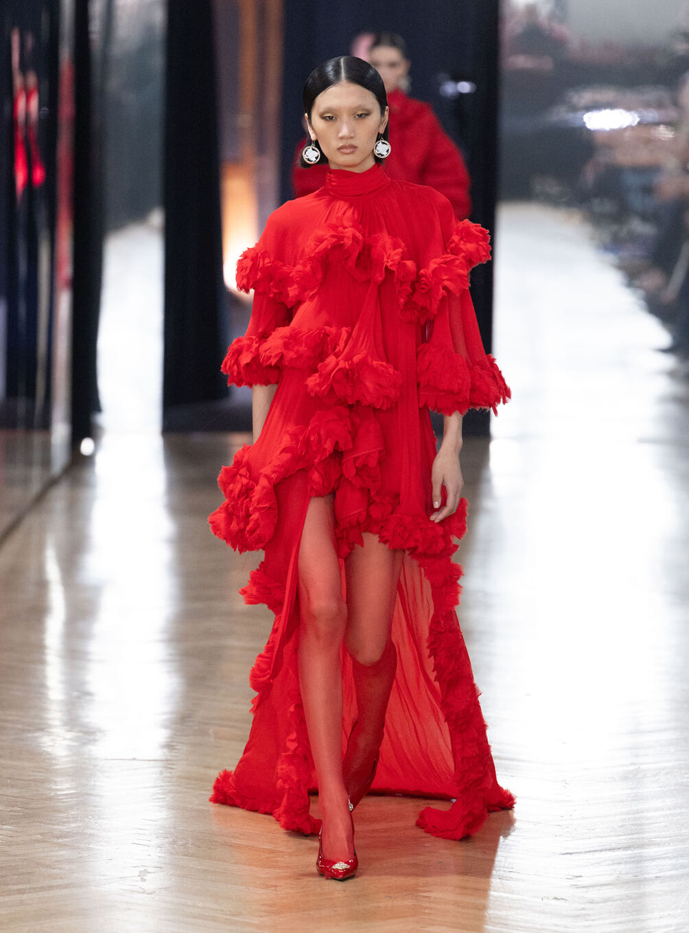 The diva personifies the Italian comprehension of glamour as power. With operatic might, she embodies a seductive spectacle of strictness and softness; of ferociousness and fragility all at once. The Blumarine Fall-Winter 2026 Collection paints a portrait of the mythological diva and her many facets through the lens of its own history. Expanding on his ongoing studies of the photographic legacy of the House – with particular reference to its collaborations with Helmut Newton – David Koma revisits Venice in an elaborate exploration of the city’s cinematic and sumptuous spirit. Staging a meeting between its baroque opulence and his own sculptural modernism and ornamentation, the Creative Director mirrors the city in the diva herself. The fusion cuts a proposal of voluminous and vivacious silhouettes rendered in a darkly theatrical palette of red, black, white, silver and gold.