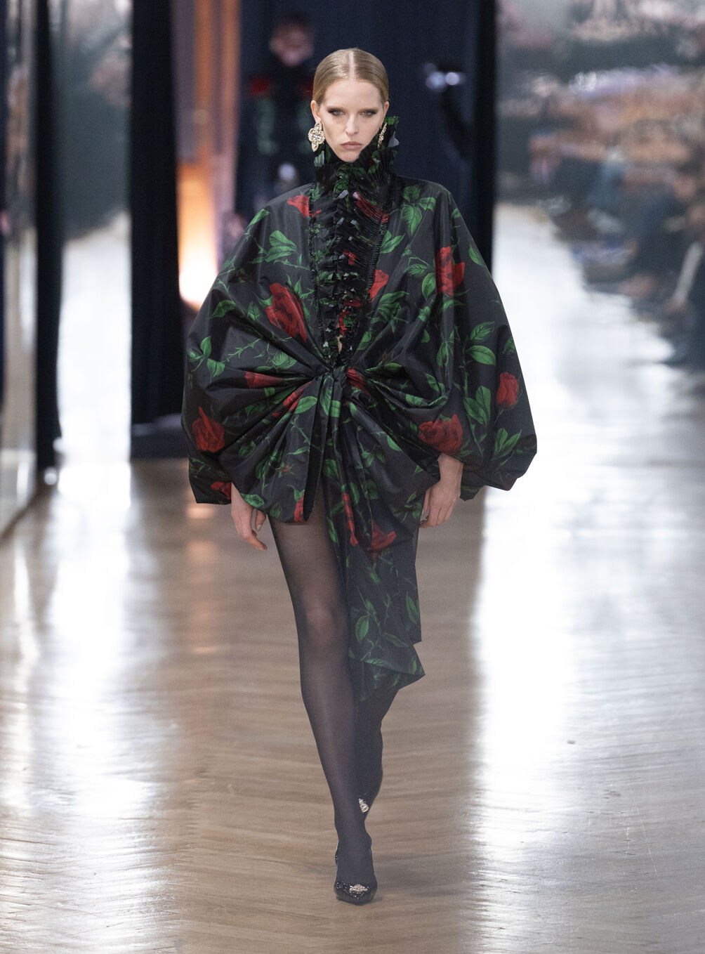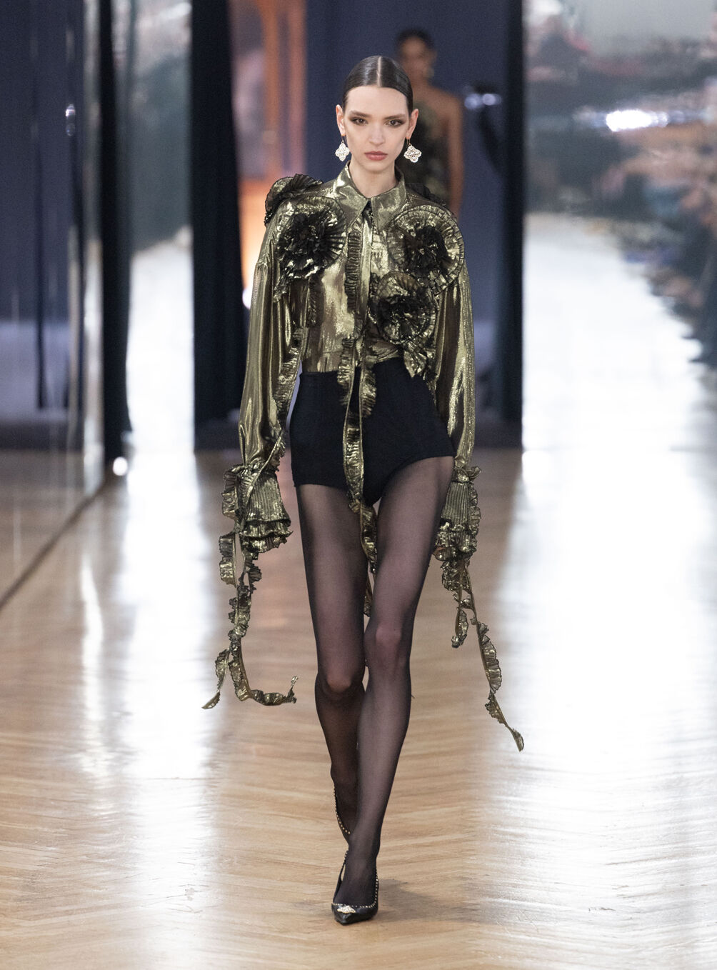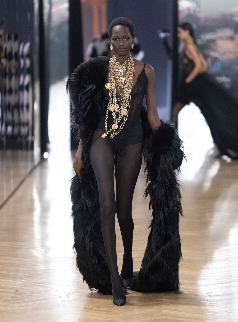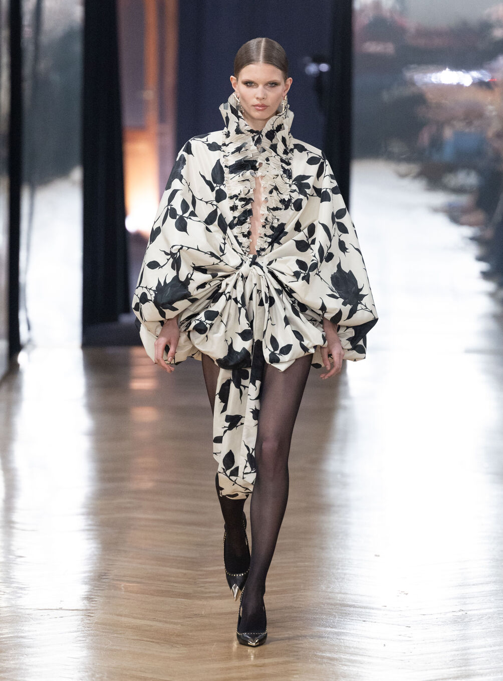 The diva personifies the Italian comprehension of glamour as power. With operatic might, she embodies a seductive spectacle of strictness and softness; of ferociousness and fragility all at once. The Blumarine Fall-Winter 2026 Collection paints a portrait of the mythological diva and her many facets through the lens of its own history. Expanding on his ongoing studies of the photographic legacy of the House – with particular reference to its collaborations with Helmut Newton – David Koma revisits Venice in an elaborate exploration of the city’s cinematic and sumptuous spirit. Staging a meeting between its baroque opulence and his own sculptural modernism and ornamentation, the Creative Director mirrors the city in the diva herself. The fusion cuts a proposal of voluminous and vivacious silhouettes rendered in a darkly theatrical palette of red, black, white, silver and gold.