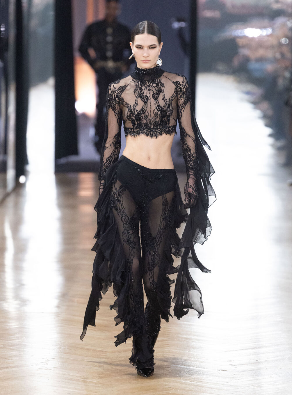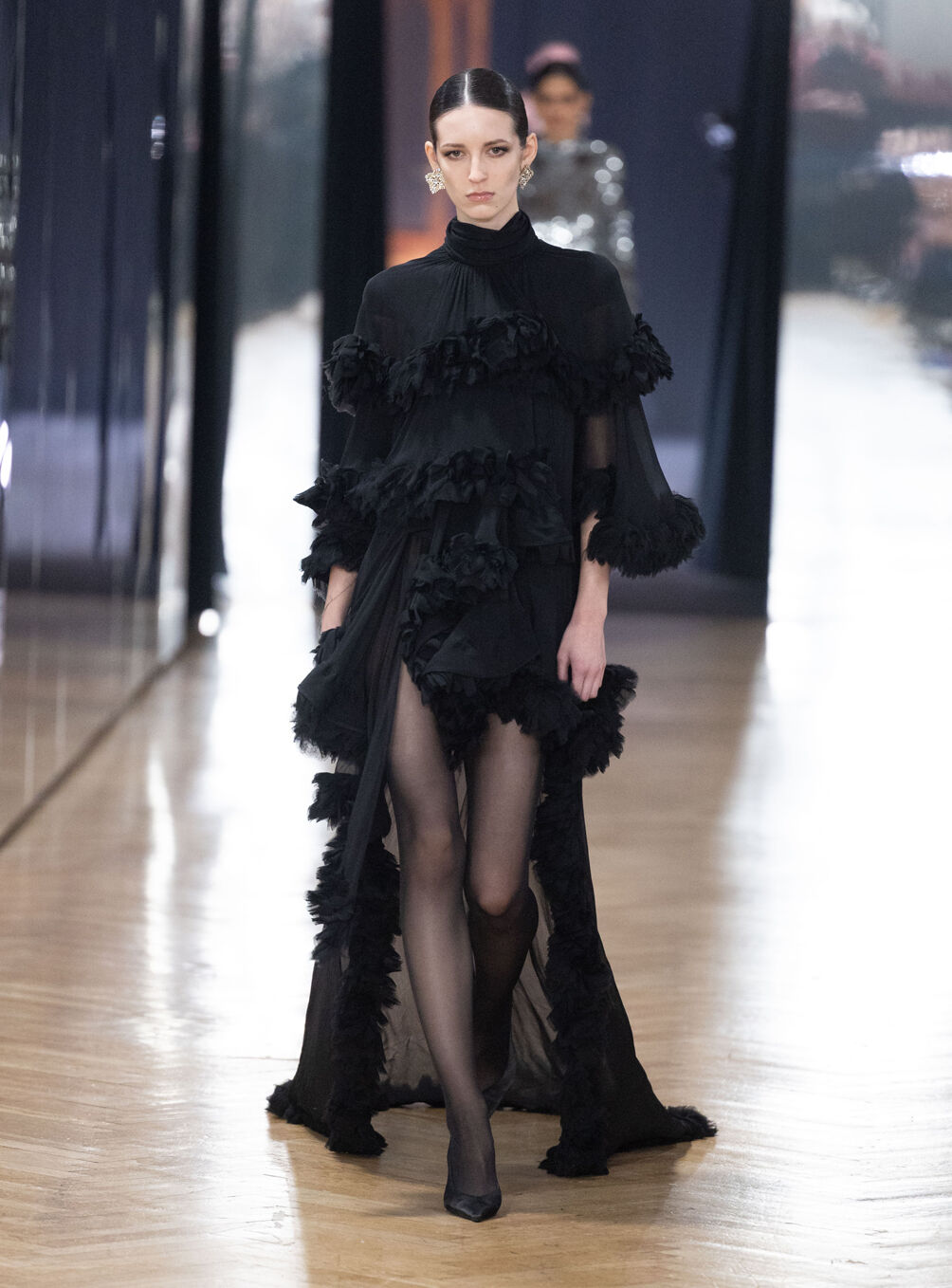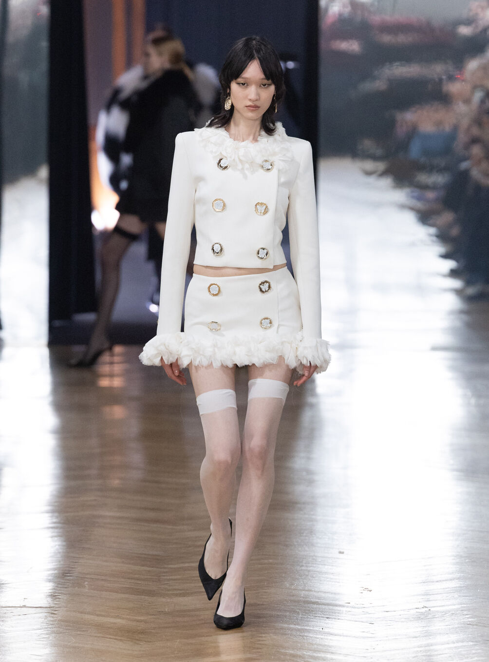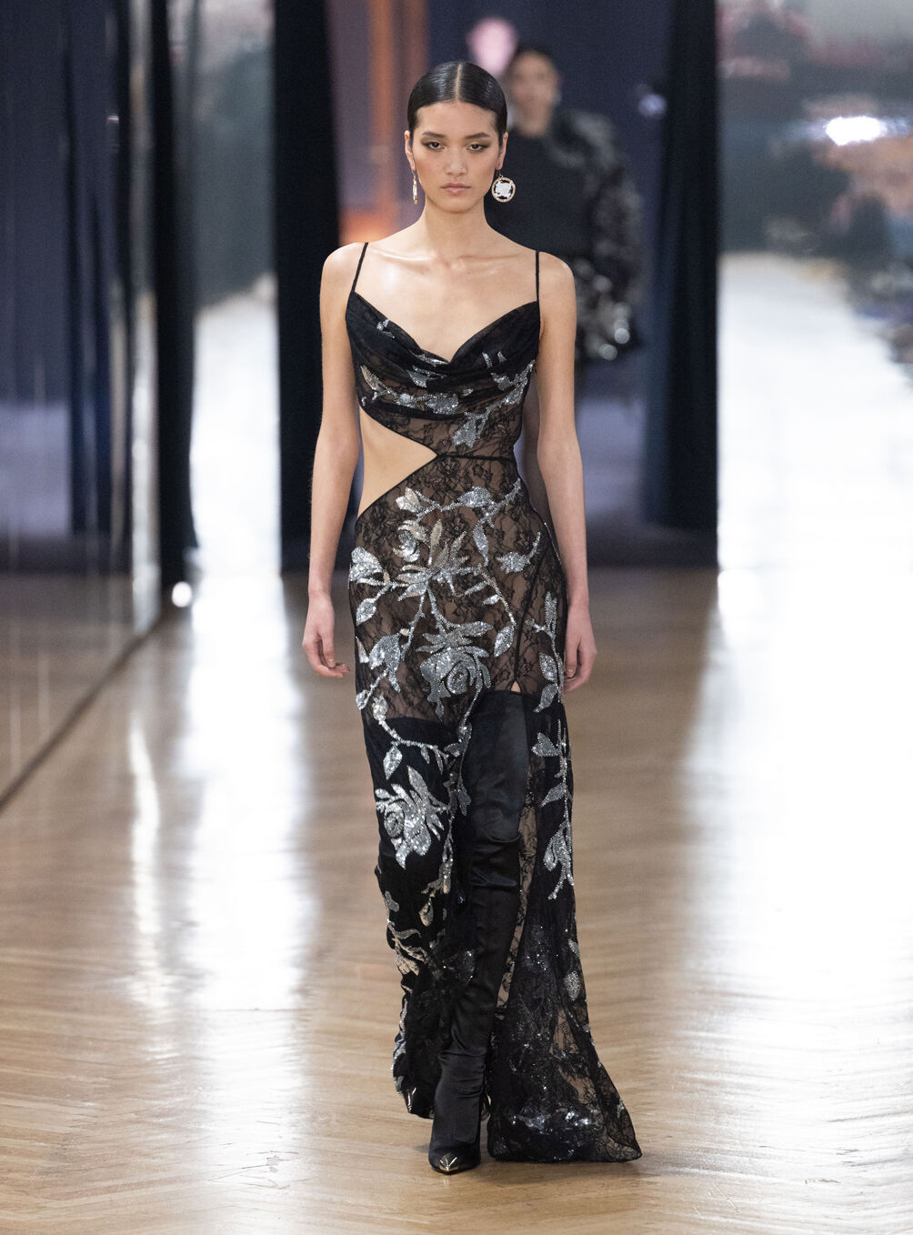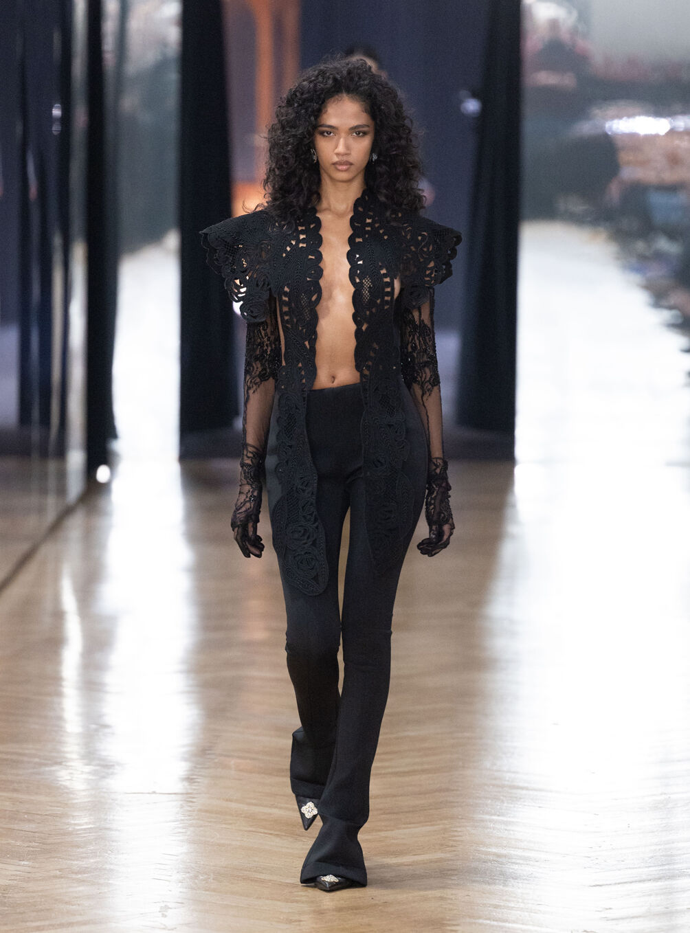 The diva personifies the Italian comprehension of glamour as power. With operatic might, she embodies a seductive spectacle of strictness and softness; of ferociousness and fragility all at once. The Blumarine Fall-Winter 2026 Collection paints a portrait of the mythological diva and her many facets through the lens of its own history. Expanding on his ongoing studies of the photographic legacy of the House – with particular reference to its collaborations with Helmut Newton – David Koma revisits Venice in an elaborate exploration of the city’s cinematic and sumptuous spirit. Staging a meeting between its baroque opulence and his own sculptural modernism and ornamentation, the Creative Director mirrors the city in the diva herself. The fusion cuts a proposal of voluminous and vivacious silhouettes rendered in a darkly theatrical palette of red, black, white, silver and gold.