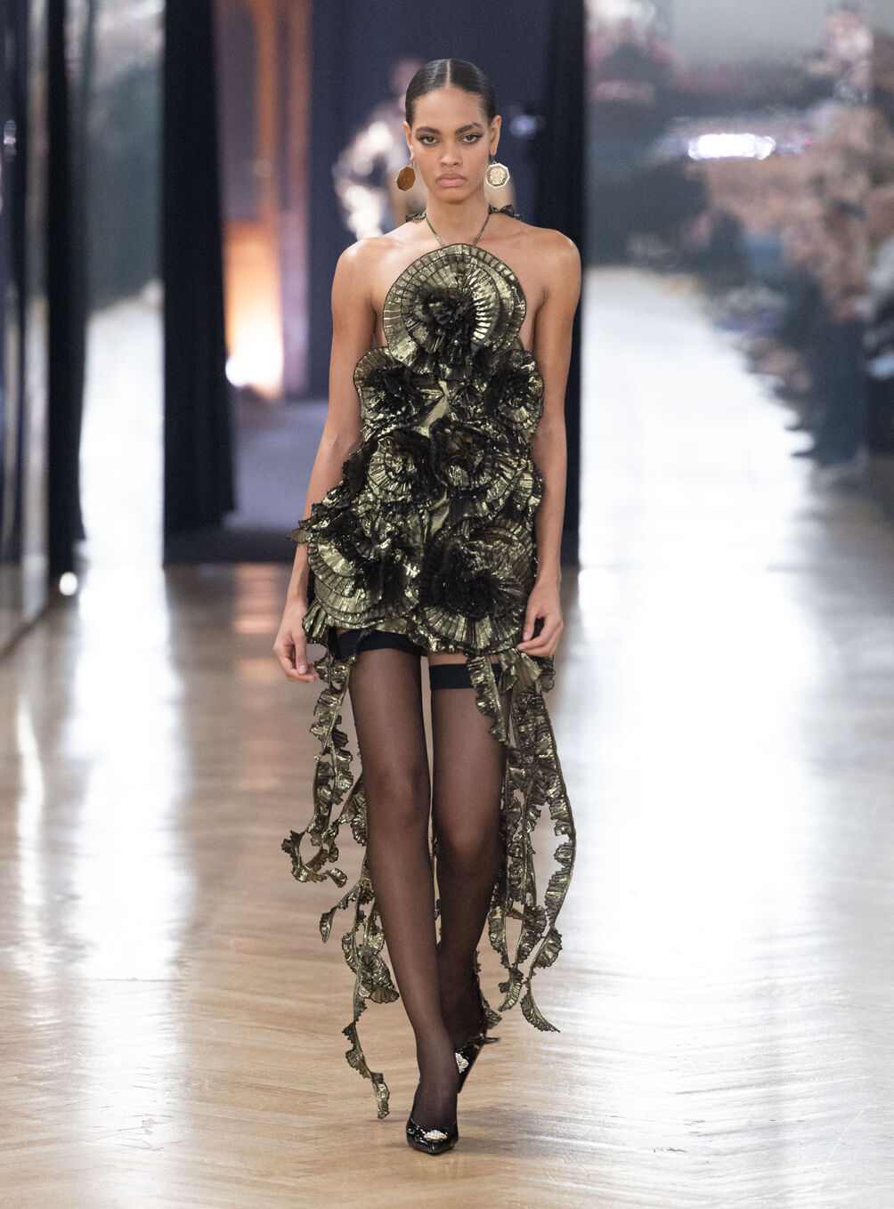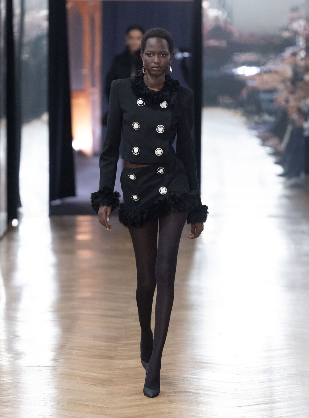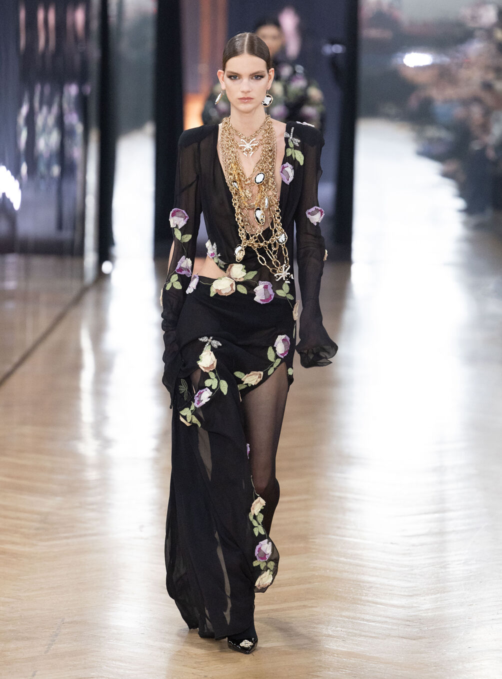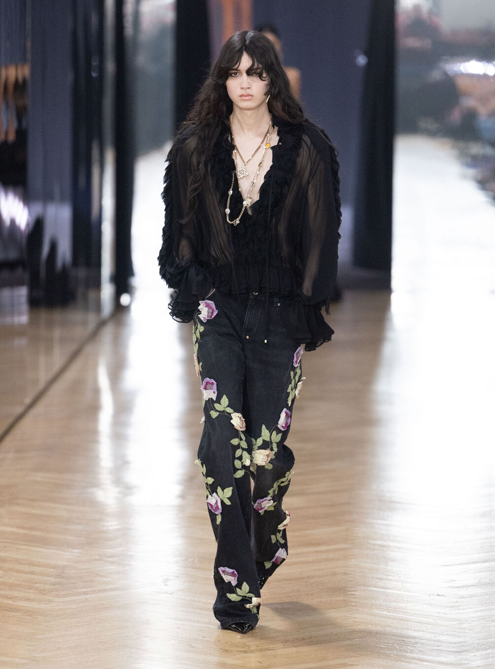 The diva personifies the Italian comprehension of glamour as power. With operatic might, she embodies a seductive spectacle of strictness and softness; of ferociousness and fragility all at once. The Blumarine Fall-Winter 2026 Collection paints a portrait of the mythological diva and her many facets through the lens of its own history. Expanding on his ongoing studies of the photographic legacy of the House – with particular reference to its collaborations with Helmut Newton – David Koma revisits Venice in an elaborate exploration of the city’s cinematic and sumptuous spirit. Staging a meeting between its baroque opulence and his own sculptural modernism and ornamentation, the Creative Director mirrors the city in the diva herself. The fusion cuts a proposal of voluminous and vivacious silhouettes rendered in a darkly theatrical palette of red, black, white, silver and gold.